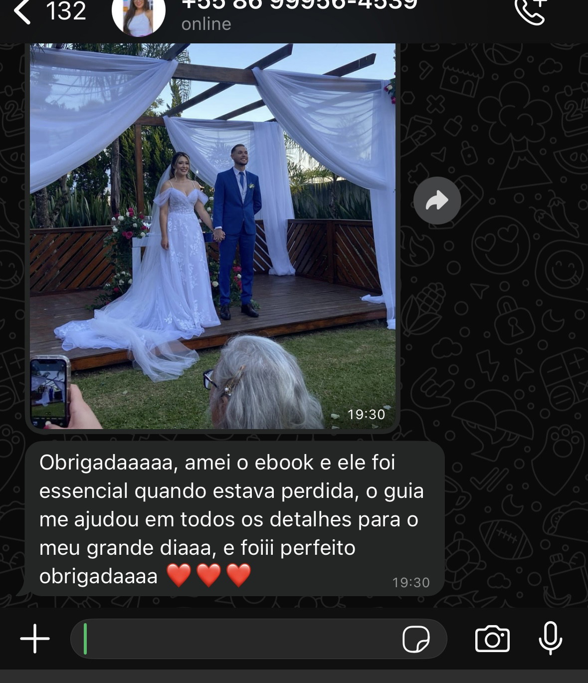 Estou falando de um guia completo que ja ajudou mais de 2532 noivinhas por todo o Brasil e você pode replicar tranquilamente, e ter o casamento que sempre sonhou gastando pouco.